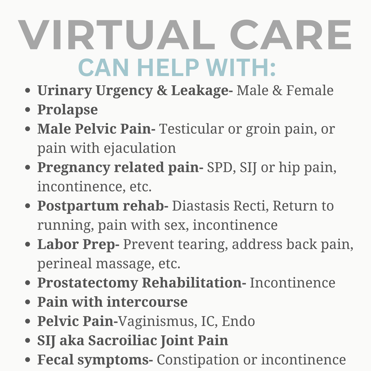 Online consultations and care available with a Doctor of Physical Therapy! We will chat about issues "down there" and how to address them... all from the privacy and comfort of your own home!